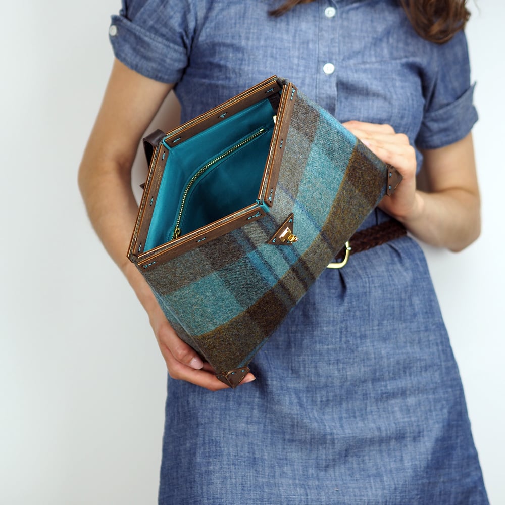 This clutch's chic exterior is a felted wool with blue, grey, and teal plaid, sourced from a mill in Yorkshire, England.